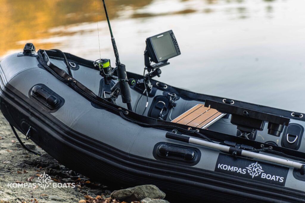 Duży nacisk położyliśmy na bezpieczeństwo. Łodzie w zależności od modelu mają aż do ośmiu komór wypornościowych. Linia życia poprowadzona po wewnętrznej stronie pokładu sprawia że cała załoga ma dostęp do bezpiecznych uchwytów. Liczne bardzo wytrzymałe D-ringi wykonane ze stali nierdzewnej umożliwiają bezpieczne zamocowanie wyposażenia i ładunku. Już nie musimy się zastanawiać gdzie przywiązać cumę czy torbę z wyposażeniem. Wyposażeniem standardowym są dulki na wiosła i pas do mocowania zasobnika z paliwem. Listwy odbojowe i dodatkowe wzmocnienia zabezpieczają łódź w newralgicznych punktach. Wodę z pokładu możemy odprowadzić spustem zabezpieczonym korkiem. Podłoga jest wykonana z wielokomorowej płyty aluminiowej zakończonej listwami nowego typu które umożliwią szybki montaż i łatwy demontaż łodzi. Łodzie w serii KB wyposażone są fabrycznie w pady montażowe dedykowane pod akcesoria kanadyjskiej firmy Scotty. Dzięki temu możemy w łatwy sposób zainstalować na pokładzie ponad 30 akcesoriów które pozwolą nam spersonalizować naszą łódź i jeszcze lepiej przystosować ją do pracy. Uchwyty na wędki, echosondę, telefon, czy windę trolingową to tylko kilka propozycji z szerokiej gamy produktów Scotty. Nasz wybór nie bez znaczenia padł na kanadyjską firmę która od lat dostarcza najwyższej jakości akcesoria wędkarskie. Fabryczny montaż mocowań zapewnia trwałość, estetyczne wykonanie i pieniądze które zostają w kieszeni właściciela łodzi Kompas Boats.