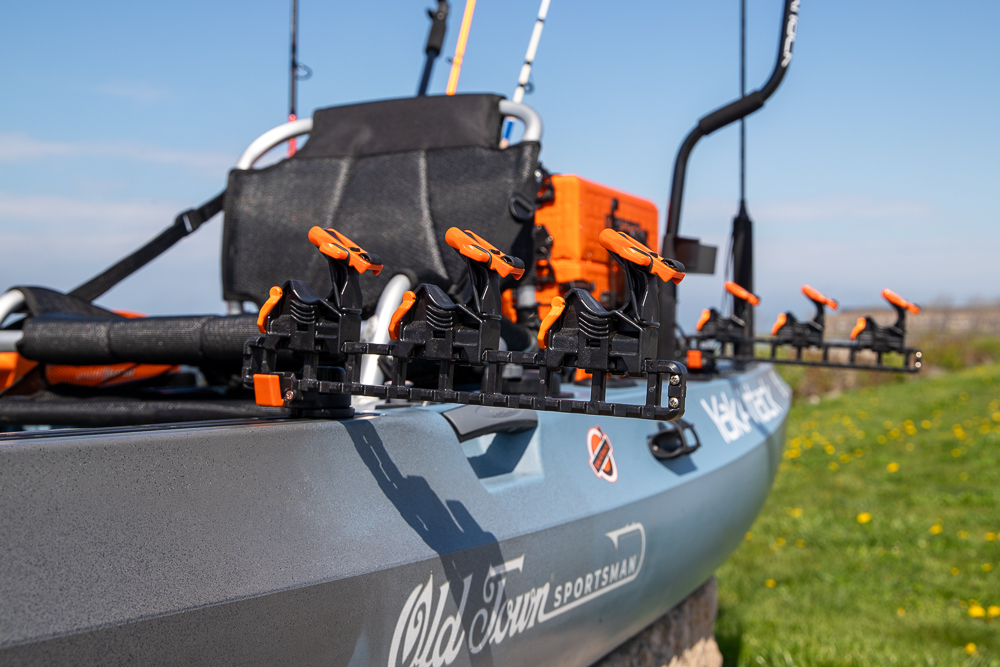 Wskazówka eksperta KOMPAS BOATS: Stojak SideStage zamontowany na bocznej szynie z przodu kajaka jest fenomenalny, ale pamiętaj o jednym! Jeśli planujesz łowić w miejscach mocno zarośniętych (np. przepływać pod nisko zwisającymi gałęziami), upewnij się, że wędki włożone w stojak nie są zbyt długie lub zamontuj stojak nieco bliżej siebie, by móc szybko położyć wędziska na płasko w razie zagrożenia zahaczeniem o konary drzew.