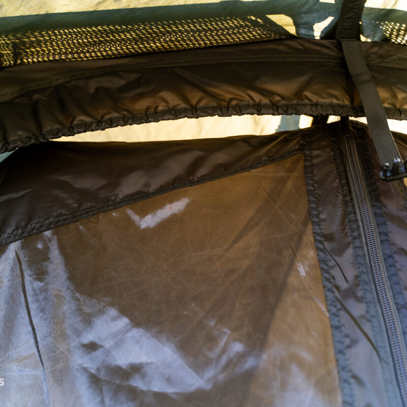 Wielofunkcyjny panel przedni: Wyposażony w duże, przezroczyste okno z PVC do całodobowej obserwacji szczytówek oraz niezawodną moskitierę, która ratuje życie podczas letnich nocy pełnych komarów.