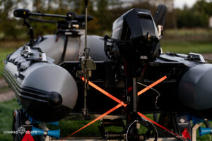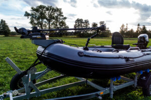 Przyczepa: Renomowanej marki Brenderup – wyposażona w rolki, co znacznie ułatwia transport i slipowanie pontonu.