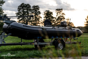 Ponton o długości KB 460 cm to doskonały wybór dla 5–6-osobowej załogi pływającej turystycznie lub dla 3–4 osób wędkujących. Warto podkreślić, że jednostki powyżej 4 metrów są nie tylko dłuższe, ale także znacznie szersze, co przekłada się na większy komfort, stabilność i przestrzeń użytkową. Różnica między modelami 430 a 460 jest wyraźnie odczuwalna — dodatkowe 30 cm pokładu zapewnia zauważalnie więcej miejsca, które można przeznaczyć na sprzęt lub swobodne poruszanie się po łodzi. Ponton KB 460 cm bez problemu pomieści cały niezbędny ekwipunek na tygodniowy urlop, zarówno turystyczny, jak i wędkarski. Do wodowania i obsługi tej jednostki najlepiej sprawdzą się minimum dwie osoby, jednak przy użyciu przyczepy podłodziowej z rolkami tulipanowymi, wprawiony operator poradzi sobie także samodzielnie. Przestrzeń na pokładzie to duży atut, dlatego jeśli planujemy dłuższe wyprawy lub zabieramy ze sobą sporo sprzętu, warto zdecydować się właśnie na ponton tej wielkości.