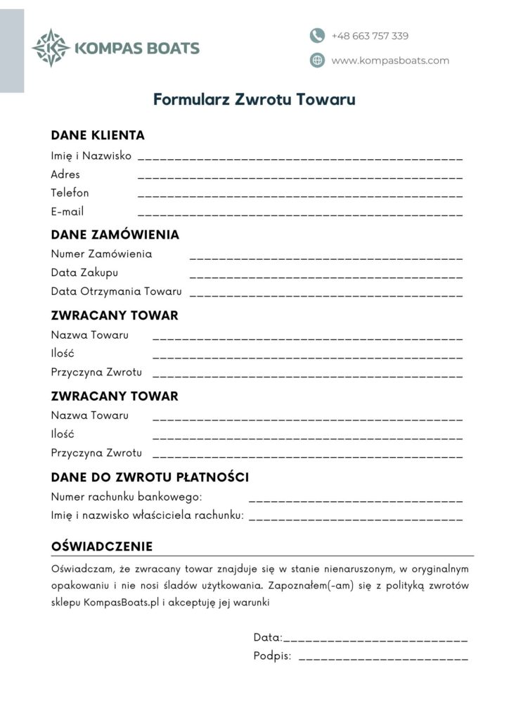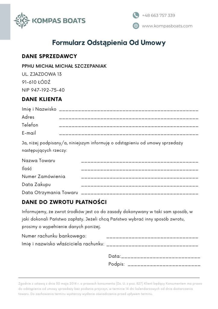 2.2. Aby skorzystać z prawa odstąpienia od umowy, klient powinien wysłać oświadczenie o odstąpieniu na adres e-mail: kontakt@kompasboats.com lub pocztą na adres siedziby sklepu.